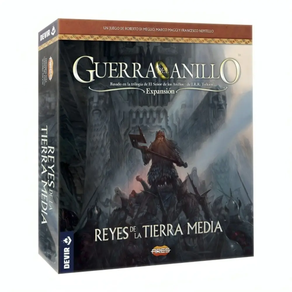 ¡Expande Guerra del Anillo con el poder de los antiguos reyes y gobernantes de los Pueblos Libres! Reyes de la Tierra Media es una expansión que requiere el juego base y que incluye 13 figuras de plástica, 5 anillos de soberano corrompido, 2 dados de acción especial, más de 30 nuevas cartas, 1 tablero de corrupción de soberano y 14 contadores, además de hojas de referencia y el reglamento.