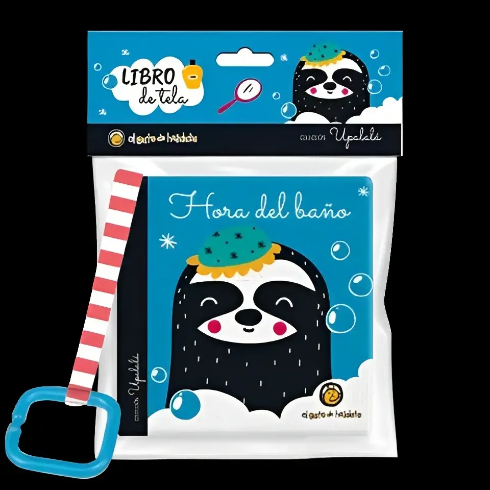 "Hora del baño"Tela suave y acolchada con relleno ruidoso. Pusera y gancho. Frases breves. Momentos del día del bebé