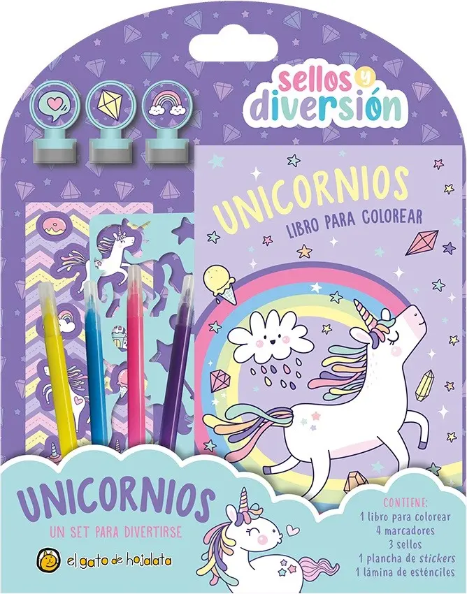 Contiene: - 1 libro para colorear - 4 marcadores - 3 sellos - 1 plancha de stickers - 1 lámina de esténciles